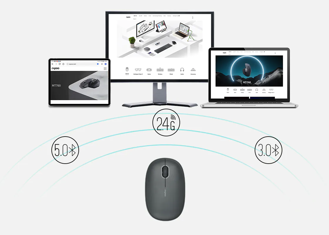 یکی از برجسته‌ترین ویژگی‌های موس M650 رپو، پشتیبانی از سه حالت اتصال بی‌سیم است: این قابلیت به شما امکان می‌دهد تا به صورت هوشمند و بدون نیاز به جابجایی فیزیکی، بین سه دستگاه مختلف مانند لپ‌تاپ، کامپیوتر رومیزی، تبلت یا حتی گوشی هوشمند جابه‌جا شوید.